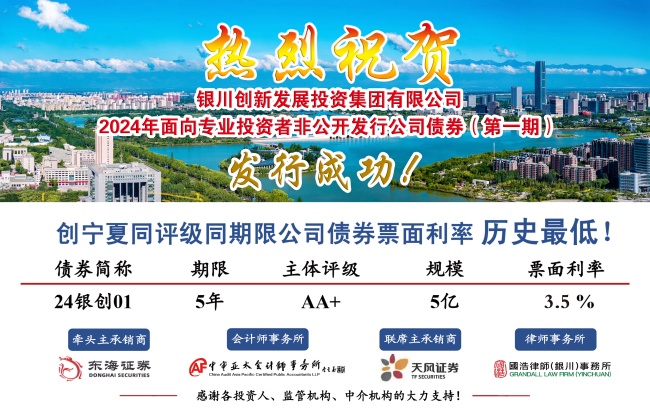 8月30日,銀川創(chuàng)新發(fā)展投資集團有限公司2024年第一期面向專業(yè)投資者非公開發(fā)行公司債券成功發(fā)行。本期債券發(fā)行規(guī)模5億元,期限:5年,票面利率:3.5%,創(chuàng)寧夏區(qū)域內5年期私募債發(fā)行利率歷史最低。本期債券的成功發(fā)行,充分體現(xiàn)了資本市場對銀川市和創(chuàng)投集團的認可,降低了集團融資成本,為集團公司后續(xù)服務銀川市產業(yè)發(fā)展奠定了良好基礎。